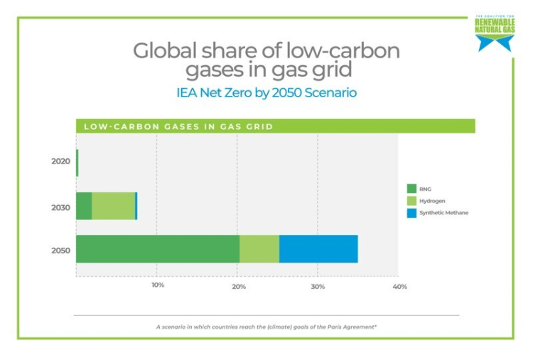 In 2019, the supply of RNG and hydrogen is about 1.5% of the total global gas grid supply (Source: igu.org). But, according to a study lead by the RNG coalition related to the projections of Paris Agreement, RNG and hydrogen could share up 25% of the total global gas grid supply in 2050.