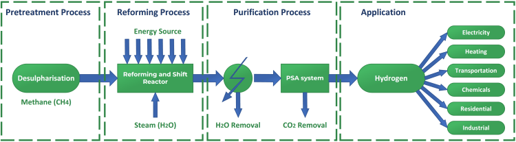 The main component of natural gas is methane (CH4), using thermal processes like steam reformation, hydrogen can be produced from it. The below Figure shows a simplified diagram of hydrogen production process from NG reforming. Depending on the whether the CO2 emissions from the reforming process is captured or not, the produced hydrogen is either called Blue or Grey Hydrogen, respectively (Source: pubs.rsc.org).